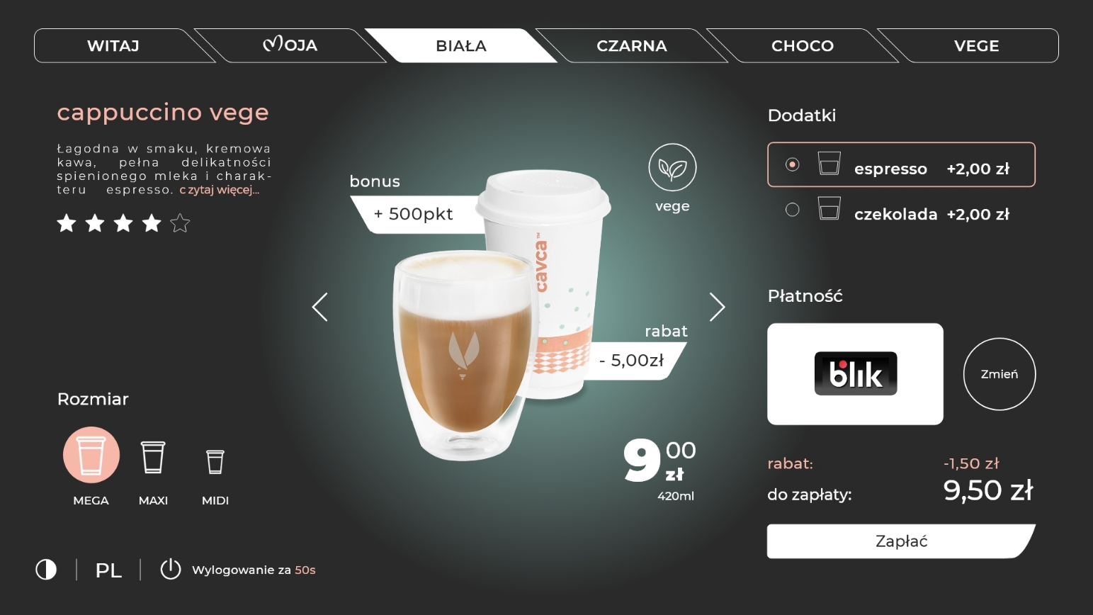 an application dedicated to the operation and ordering of coffee from CAVCA stations equipped with Melitta coffee machines. Customers can easily and quickly order their favorite coffees, customizing them to their preferences. The application enables online payments, which are convenient and secure, and also allows for tracking purchase history and using loyalty programs. Thanks to an innovative approach to coffee ordering - just a cup is enough to get your favorite personalized drink with a single click. The machine can be operated using the customer's phone app or the touchscreen on the device.