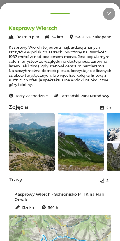 InfoSzczyt is a user-friendly mobile application designed for mountain enthusiasts, enabling them to easily locate and explore various mountain peaks. The app features an integrated compass, GPS tracking, and interactive topographic maps, providing real-time data and detailed information on nearby summits. With its intuitive interface and essential functionalities, InfoSzczyt enhances the outdoor experience by helping users navigate and discover the beauty of nature with confidence.